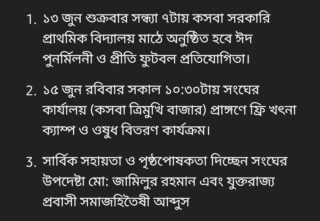 অন্যদিকে, ১৫ জুন, রবিবার সকাল ১০টা ৩০ মিনিটে, কসবা ত্রিমুখি বাজারস্থ গোলাবশাহ সমাজকল্যাণ সংস্থার কার্যালয়ে অনুষ্ঠিত হবে ফ্রী খৎনা ক্যাম্প ও ওষুধ বিতরণ কর্মসূচি। এই মানবিক উদ্যোগটি বাস্তবায়িত হচ্ছে সংগঠনের উপদেষ্টা মো: জামিলুর রহমান এবং যুক্তরাজ্য প্রবাসী আব্দুস সালেহ-এর সৌজন্যে। গ্রামের আগ্রহী শিশুদের এই ক্যাম্পে বিনামূল্যে খৎনা এবং প্রয়োজনীয় ওষুধ সরবরাহ করা হবে।