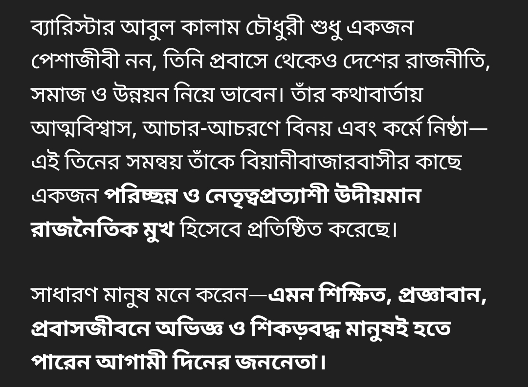 প্রবাস জীবনের বৈচিত্র্য, অভিজ্ঞতা আর দৃঢ় প্রত্যয়ে নিজেকে প্রতিষ্ঠিত করেছেন একাধারে আইনজীবী, সংগঠক ও সমাজসেবক হিসেবে—এমনই একজন নাম ব্যারিস্টার আবুল কালাম চৌধুরী। কিন্তু তাঁর পরিচয় এখানেই থেমে থাকে না। শিকড়ের টানে বারবার ফিরে আসেন বিয়ানীবাজারের মানুষের কাছে, চারখাইয়ের সরল মাটির গন্ধে। সাধারণ মানুষের ভেতর তাঁকে ঘিরে জন্ম নিচ্ছে এক সম্ভাবনার স্বপ্ন—একজন পরিশীলিত, আধুনিক ও যোগ্য নেতৃত্বের স্বপ্ন।
