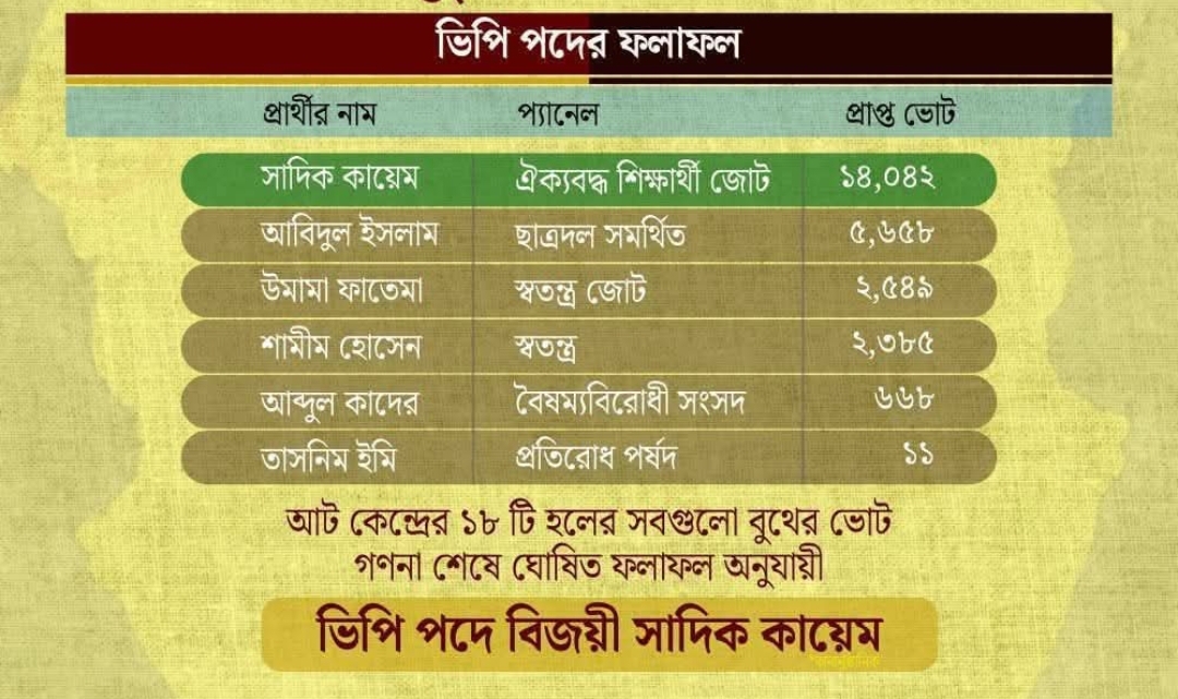 ফলাফলে দেখা যায়, ১৬টি হলে ভিপি পদে সাদিক কায়েম পেয়েছেন ১২ হাজার ৬৭৪ ভোট, যা ছাত্রদল সমর্থিত প্রার্থী আবিদুল ইসলাম খানের প্রাপ্ত ৫ হাজার ২২১ ভোটের চেয়ে দ্বিগুণেরও বেশি। সুফিয়া কামাল হল, শহীদুল্লাহ হল, রোকেয়া হলসহ বেশিরভাগ হলে শিবির-সমর্থিত প্যানেল ব্যাপক ব্যবধানে জয়লাভ করেছে।