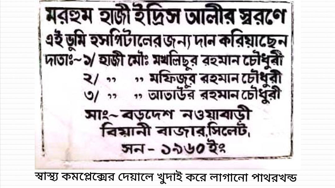 প্রায় ছয় দশক আগে তৎকালীন পূর্ব পাকিস্তানে প্রেসিডেন্ট ফিল্ড মার্শাল আয়ুব খান গ্রামীণ স্বাস্থ্য ব্যবস্থার উন্নয়নে নতুন হাসপাতাল নির্মাণের উদ্যোগ নেন। সেই সময়ে বিয়ানীবাজারের লংকা টিলা আনারস বাগান রকম ভূমির মালিক হাজী মখলিছুর রহমান চৌধুরী দুই ভাই—হাজী মফিজুর রহমান ও হাজী আতাউর রহমান চৌধুরীর সঙ্গে পরামর্শ করে পাকিস্তান সরকারকে ৫ একর জমি বিনামূল্যে দান করেন। ২৭ জুন ১৯৬০ সালের দলিল (নং ২৮৯২/১৯৬০) অনুযায়ী জমিটি সরকারের নামে নিবন্ধিত হয়। দলিলের ভাষ্য অনুযায়ী হাসপাতালের দেয়ালে দাতাদের নামফলক সংরক্ষণ এবং পরিবার থেকে একজনকে কমিটিতে রাখার বিধানও রাখা হয়। তখন থেকেই দাতাদের মহানুভবতা বিয়ানীবাজারে জনসেবার এক নতুন অধ্যায় সূচনা হয়।