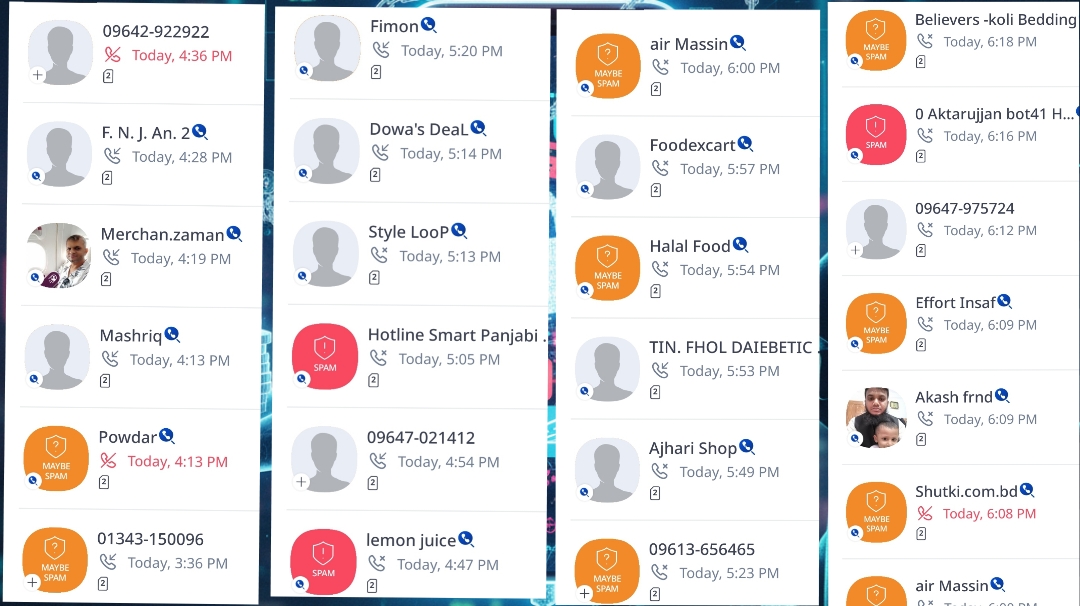 ৩০ অক্টোবর ২০২৫ তারিখ বিকেল থেকে আতাউর রহমান একাধিক সন্দেহজনক ও হয়রানিমূলক ফোনকল পেয়েছেন। এসব কল এসেছে 01343-150096, 09642-922922, 09647-021412, 09613-656465, 09647-975724, 09647-001065, Merchant Zaman, Powdar, Lemon Juice, Hotline Smart Panjabi, Style Loop, Urbanland, Fimon, Ajhari Shop, Tin.Fol.Daiebete, Halal Food, Foodexcart, Air Massin, Manshil, Shutki.com.bd, Effort Insaf, Aktarujjan, Honey, Natore, Jahid Dewan ও Montu Bai নাম্বারসহ আরও কয়েকটি উৎস থেকে। রাত ৭টা ২০ মিনিট পর্যন্ত মোট ৪১ বার ফোন করা হয়। এর বেশ কয়েকটি কল “SPAM” বা “MAYBE SPAM” হিসেবে চিহ্নিত হয়েছে।