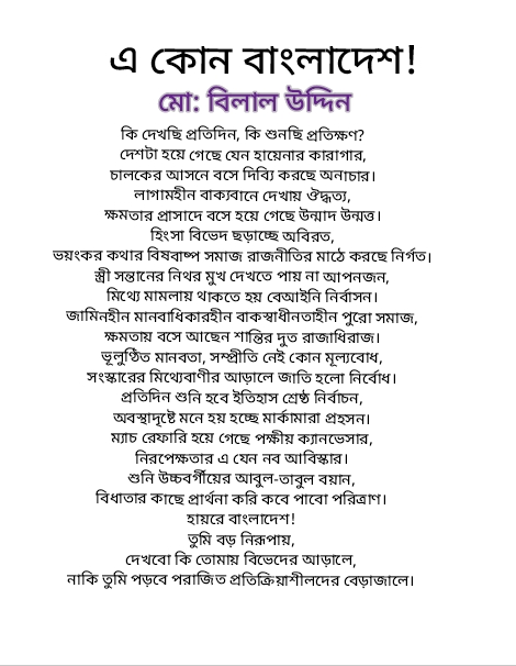আমার বাল্যবন্ধু, মানুষ গড়ার কারিগর মো. বিলাল উদ্দিন তাঁর ফেসবুক টাইমলাইনে সম্প্রতি “এ কোন বাংলাদেশ!” শিরোনামে একটি কবিতা প্রকাশ করেছেন। কবিতাটি মনোযোগ সহকারে পড়ার পর এর ভাবার্থ বর্তমান বাস্তবতার সঙ্গে এমনভাবে মিলে যায় যে, তা নিয়ে ভাবতে গিয়ে এই সংক্ষিপ্ত আলোচনার অবতারণা মাত্র।